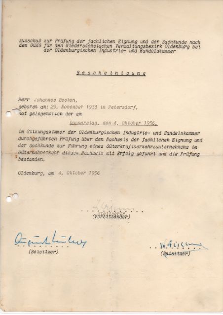 Am Heiligabend des Jahres 1956 meldete der Firmengründer Johannes Beeken seine Firma Johannes Beeken Fuhr- u. Baggerunternehmen, Bösel an. Die ersten Tätigkeitsschwerpunkte waren die Lieferung von Füllsand sowie Transporte. Zwei Monate vorher hatte der 23 jährige vor der Industrie- und Handelskammer in Oldenburg seine Nahverkehrsprüfung abgelegt. Der Sitz der Firma war zunächst das Elternhaus in Petersdorf.