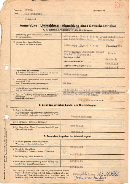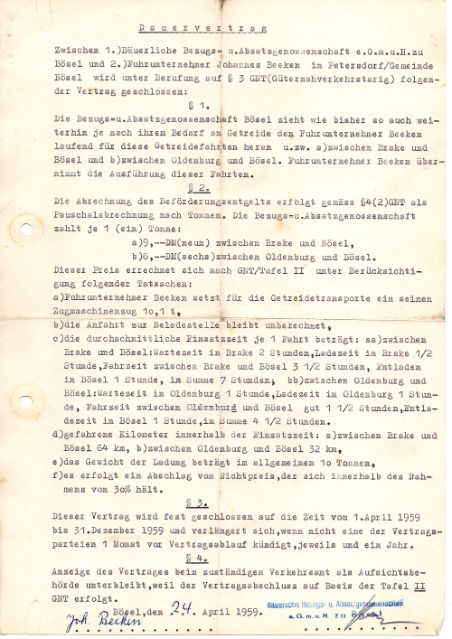 Die ersten und bedeutendsten Auftraggeber waren die Bäuerliche Warengenossenschaft, das Moorgut Kartzfehn und die Mühle Themann in Bösel, für die Johannes Beeken als Transportunternehmer Getreide von Brake und Oldenburg nach Bösel fuhr.