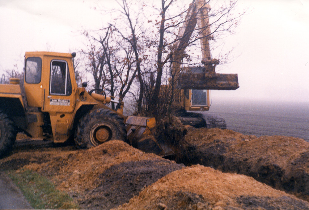 1980Im Jahre 1975 machte der Betrieb in der stetigen Aufwärtsentwicklung einen weiteren riesigen Schritt nach vorn. Vom Wasser- und Bodenverband der Friesoyther Wasseracht wurde der Auftrag erteilt, Grabenräumarbeiten durchzuführen. Dies bedeutete die Anschaffung von Grabenräumgeräten und die Erweiterung des Maschinenbestandes. Für die Bewältigung der Arbeiten wurden Räumkolonnen von je 5 bis 6 Mann eingestellt. So wuchs die Arbeitnehmerzahl auf zeitweise 38 Beschäftigte an.