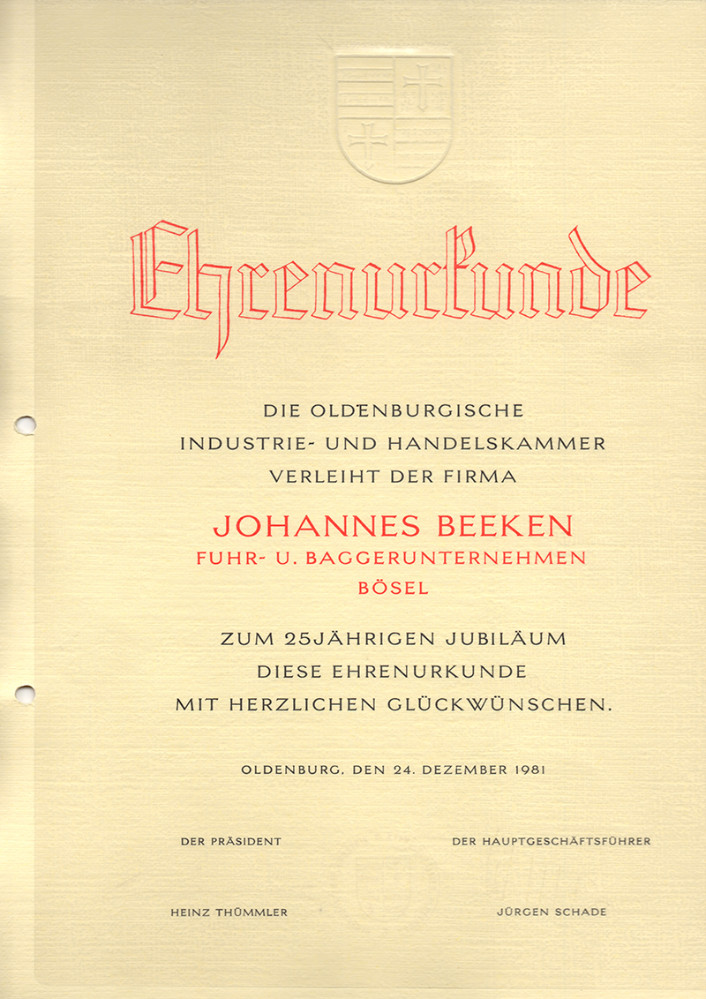 1975Durch die gute Arbeit und die – bis zum heutigen Tage – zuverlässigen Mitarbeiter machte sich die Firma Joh.Beeken einen guten Namen in und um Bösel, so dass auch Kommunen, Ämter und Verbände auf die Firma aufmerksam wurden. Durch sie bekam das Unternehmen Auftrage für die Erstellung von Straßen, Wegen und Plätze. Es gibt wahrscheinlich nur wenige Häuser in Bösel, die ohne die "Dienstleistung" der Firma Beeken erstellt worden sind.
