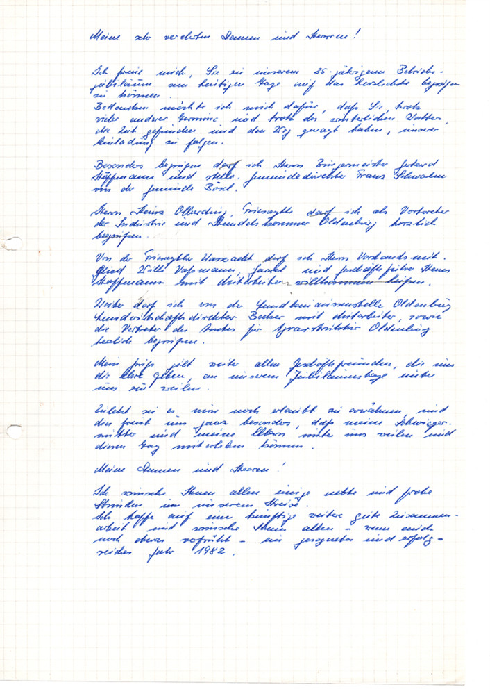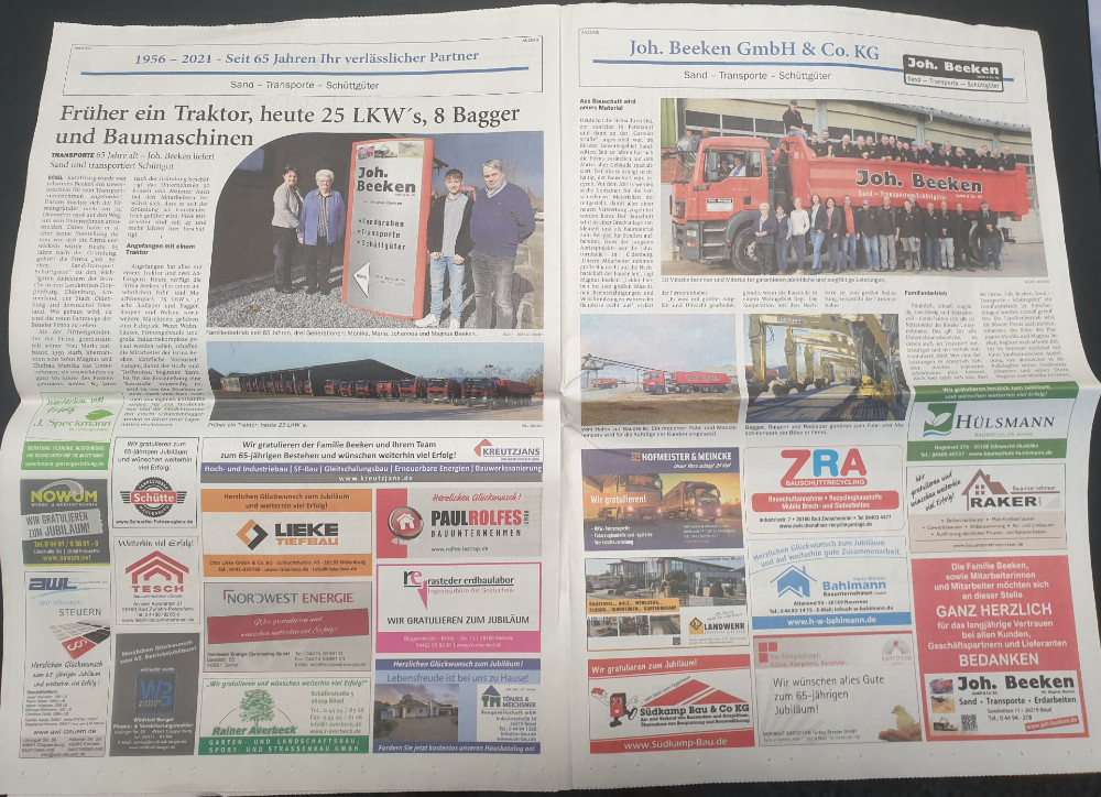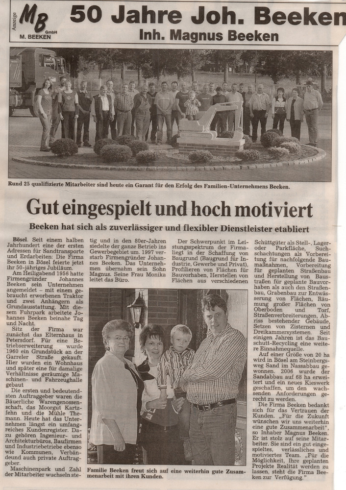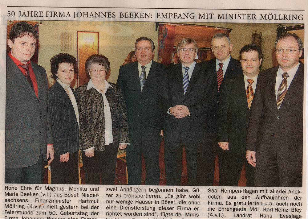 Das Unternehmen feiert sein 50jähriges Betriebsjubiläum – ein halbes Jahrhundert und immer noch ist es ein Familienunternehmen! Anlässlich dieses Jubiläums empfingen die Seniorchefin Maria Beeken, sowie Magnus und Monika Beeken zahlreiche Ehrengäste zu einem Empfang im Saal Hempen-Hagen, u.a. der Niedersächsische Finanzminister Hartmut Möllring, Mdl Karl-Heinz Bley sowie Bürgermeister Hermann Block. Die Laudatio hielt Ludger Beeken, Bruder des verstorbenen Firmengründers.
